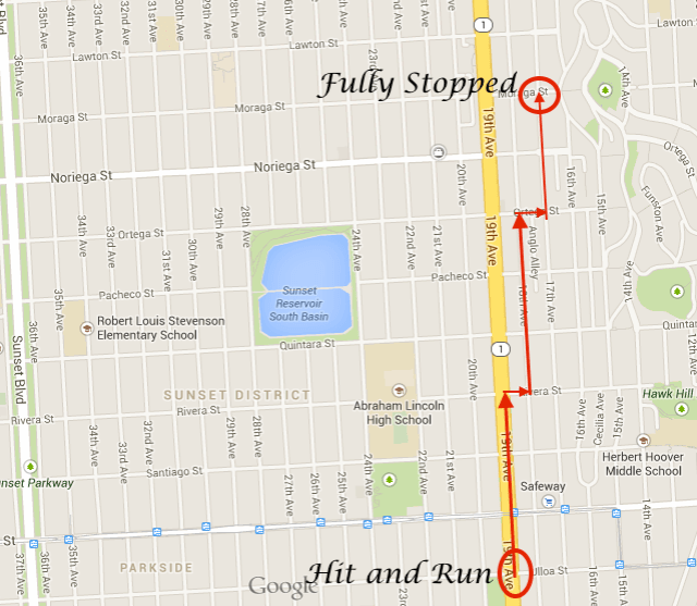 As soon as the street light changed to green, this guy came from behind really fast trying to slide into two cars – my car and another, and hit my mirror. When he realized he hit it, he looked back and tried running away as fast as possible. And this is the moment I speeded up fully and tried chasing and stopping him. I drove two blocks trying to catch him up at 19th Avenue before he made a fast turn to the right in Rivera Street, and then once again in 18th Avenue to the left. At this moment I was calmed yet excited and knew he wasn’t going anywhere away from me and my car. The biker quickly glanced back and looked at me, yet kept going and made a turn in Ortega Street to the right and quickly again a left turn in 17th Avenue. I was speeding as fast as my car could, and after 10 blocks I was just right behind the motorcycle, which was the moment he realized he couldn’t run away from me and decided to fully stop and parked on the sidewalk of Moraga Street and 17th Avenue.